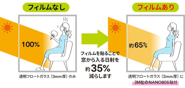 夏の強烈な日差しによるジリジリと肌を焼くような不快な暑さを、遮熱フィルムを貼ることで、外からの熱を大幅に軽減します。