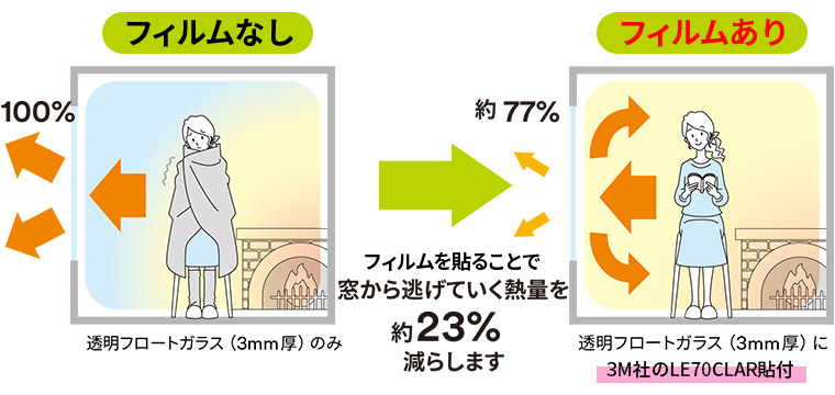 夏はフィルムが太陽の熱を遮り、室内の温度上昇を防ぐので、エアコン(冷房)の効きが良くなります。冬はフィルムが断熱効果を発揮し、部屋の暖かさを逃がさず保ち、エアコン(暖房)効率も向上します。